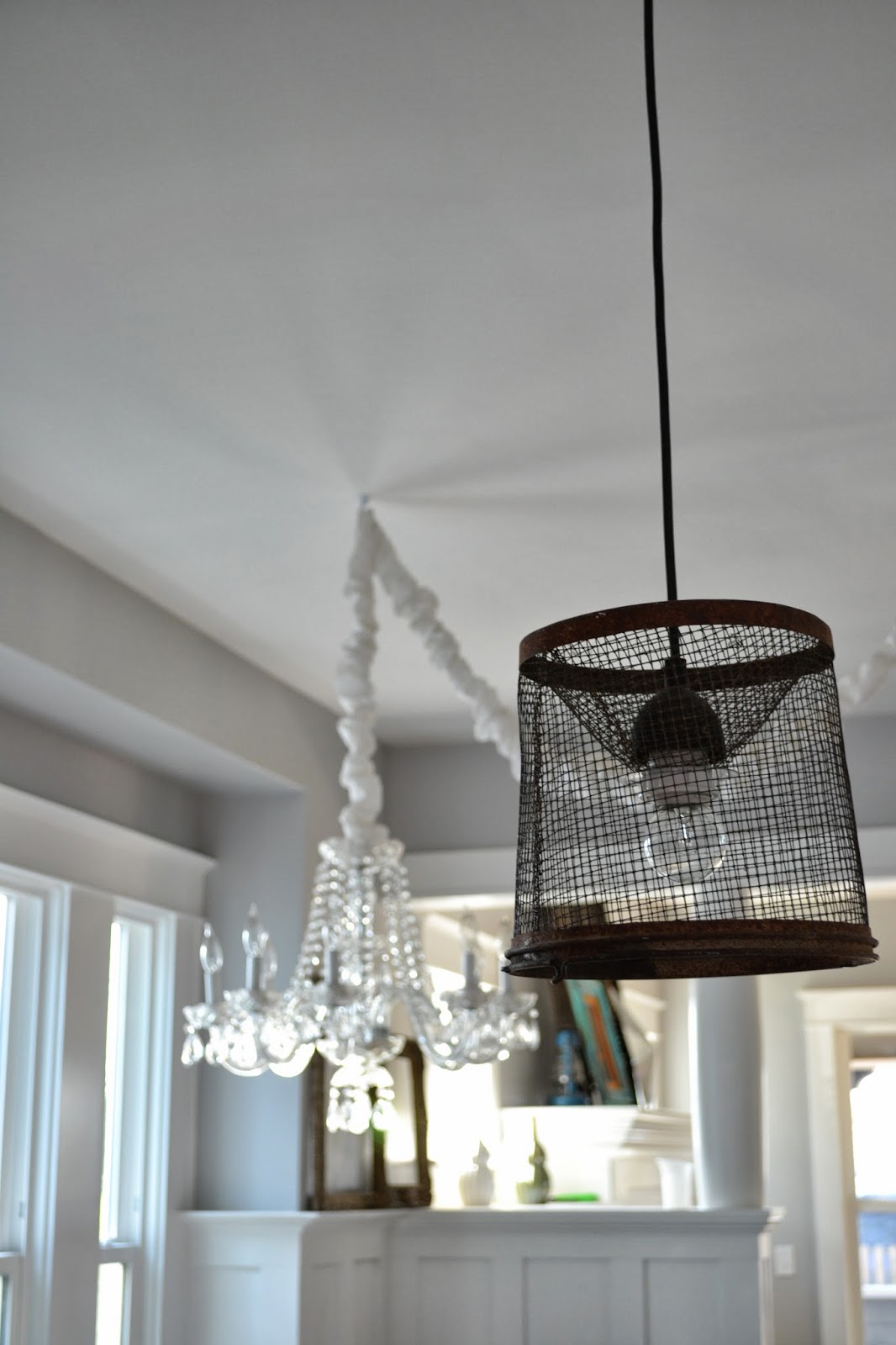 Pendant light kits and old rusty Crawfish traps were an inexpensive lighting option for overhead, and cast the most beautiful pattern on the ceiling above. They also lend a nice contrast to the crystal Dining Room chandelier.